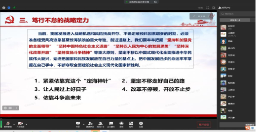 为进一步落实党员教育,深入开展学习贯彻习近平新时代中国特色社会主义思想主题教育。6月28日上午,太阳成集团tyc122cc研究生第二党支部全体党员在线上参加以“立志复兴伟业,踔厉奋发前行”为主题的党课学习,此次党课由支部书记高娟主讲。