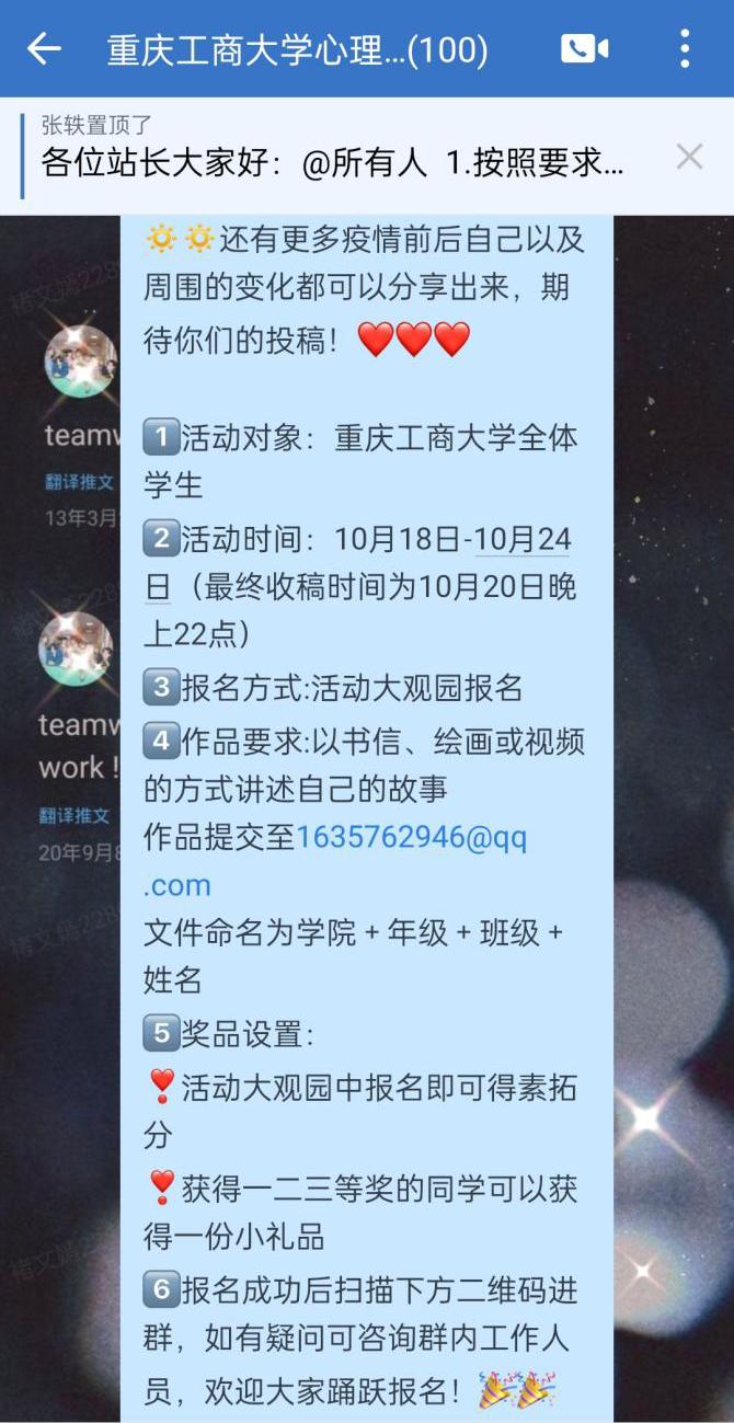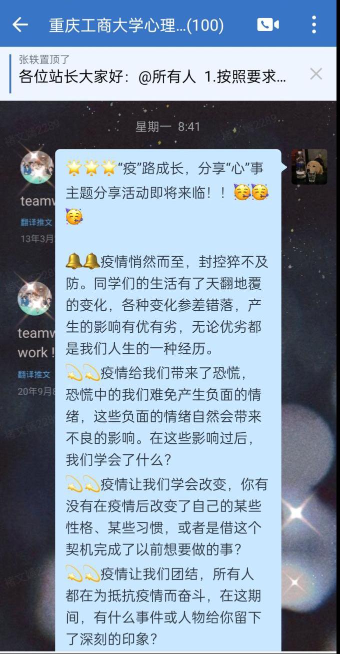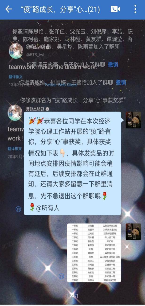 为进一步了解学生疫情期间的心理状态,缓解同学们因疫情期间产生的焦虑心情,太阳成集团tyc122cc心理工作站于10月18日组织开展“疫路有你,分享心事”线上主题分享活动,向全体在校学生征集疫情期间印象深刻的故事或自身的心路历程。同学们积极参与,共计500余名同学参加投稿。