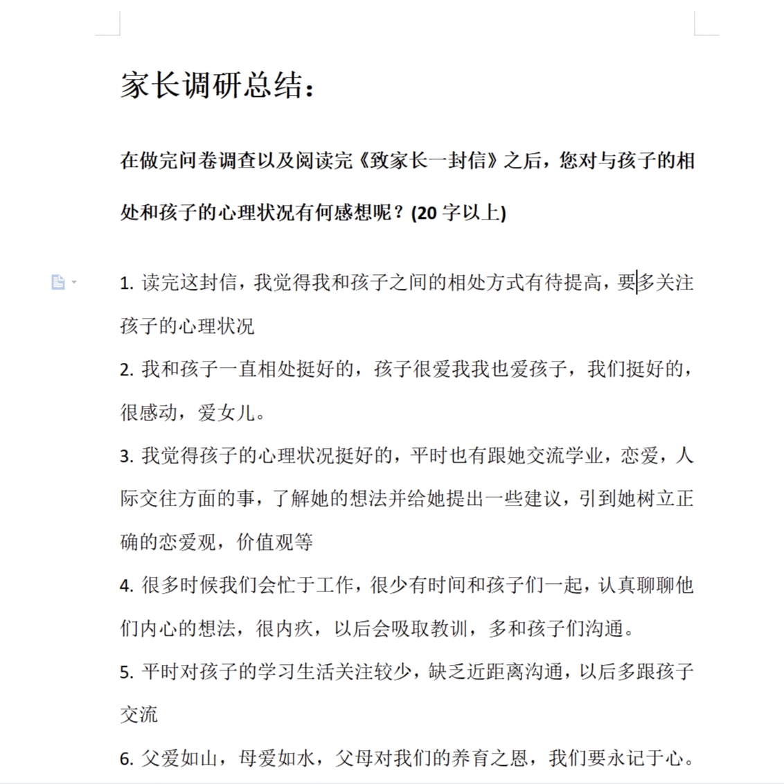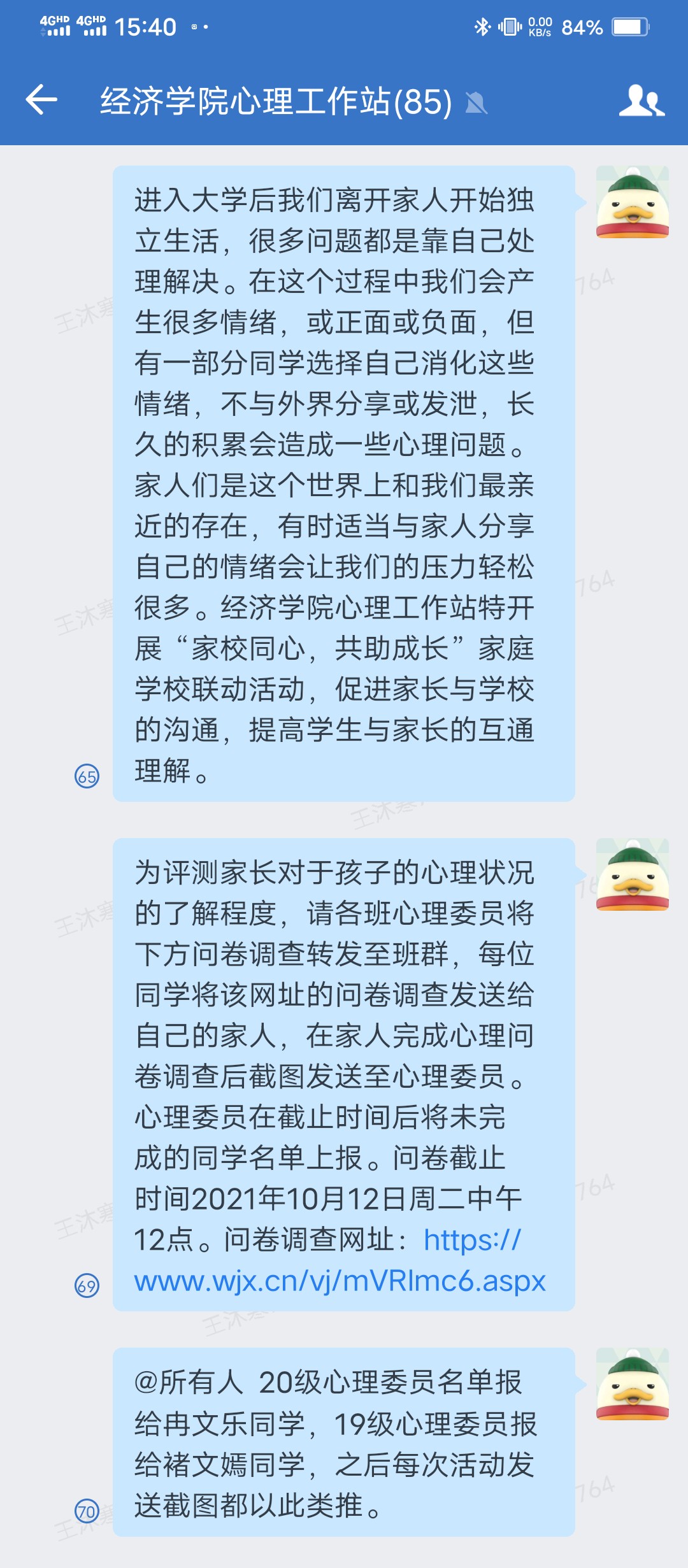 基于家长们的积极回应参与,心理工作站了解到家长们对此活动认同度较高、感触较深,有家长反馈:“很多时候我们会忙于工作,很少有时间和孩子们一起,认真聊聊他们内心的想法,很内疚,以后会吸取教训,多和孩子们沟通”,“能参加这样有意义的活动我很开心,孩子心理很健康,我也需要也多多沟通,孩子也喜欢事情多交流,以后也会多多注意孩子的心理健康问题”,“首先感谢学校和老师学生心理健康的关注。学生家长们纷纷表示,今后除了继续关心孩子的学习、生活情况外,同时也要注重关注孩子的心理状况、情绪变化等,积极沟通,正面引导,让孩子健康,阳光地成长。