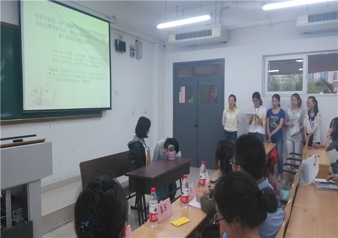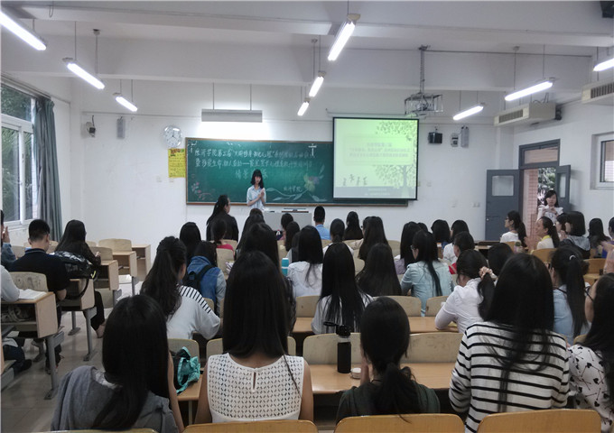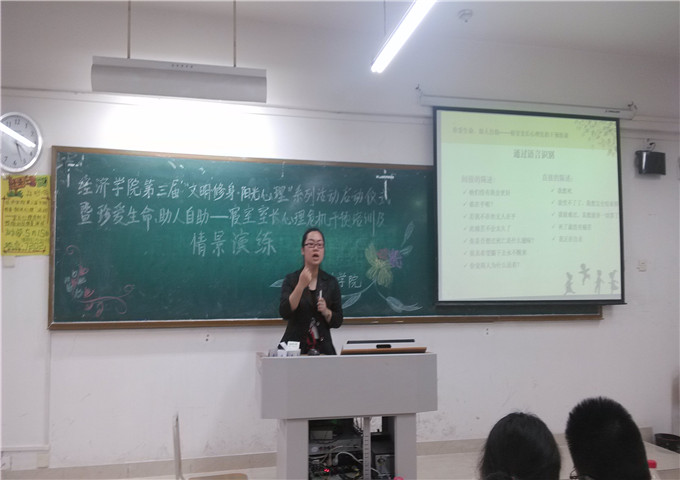 接下来郝颖老师先简单介绍了本次系列活动的具体安排,紧接着进行了精彩的培训讲座,通过PPT展示,加上精彩的语言组织能力,把大学生的心理活动分析的很是生动。偌大的教室座无虚席,大家聆听老师讲话的时候,有的还若有所思,郝颖老师还积极地跟同学解答一些心理上的问题和疑惑。