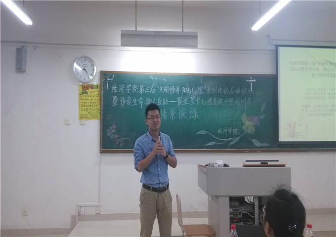 之后是心理问题干预的情景演练,通过情景短剧的方式展现了当同学心理问题出现时,室友是如何安慰,又是如何向老师反映,与老师一起关爱失意的同学,最后同学又是如何重新振作起来。情节设计巧妙,紧凑,生动形象地表现出了解决大学生心理问题的最佳方案,在培训室长们进行心理危机干预该采取的措施上给出了很好的建议。