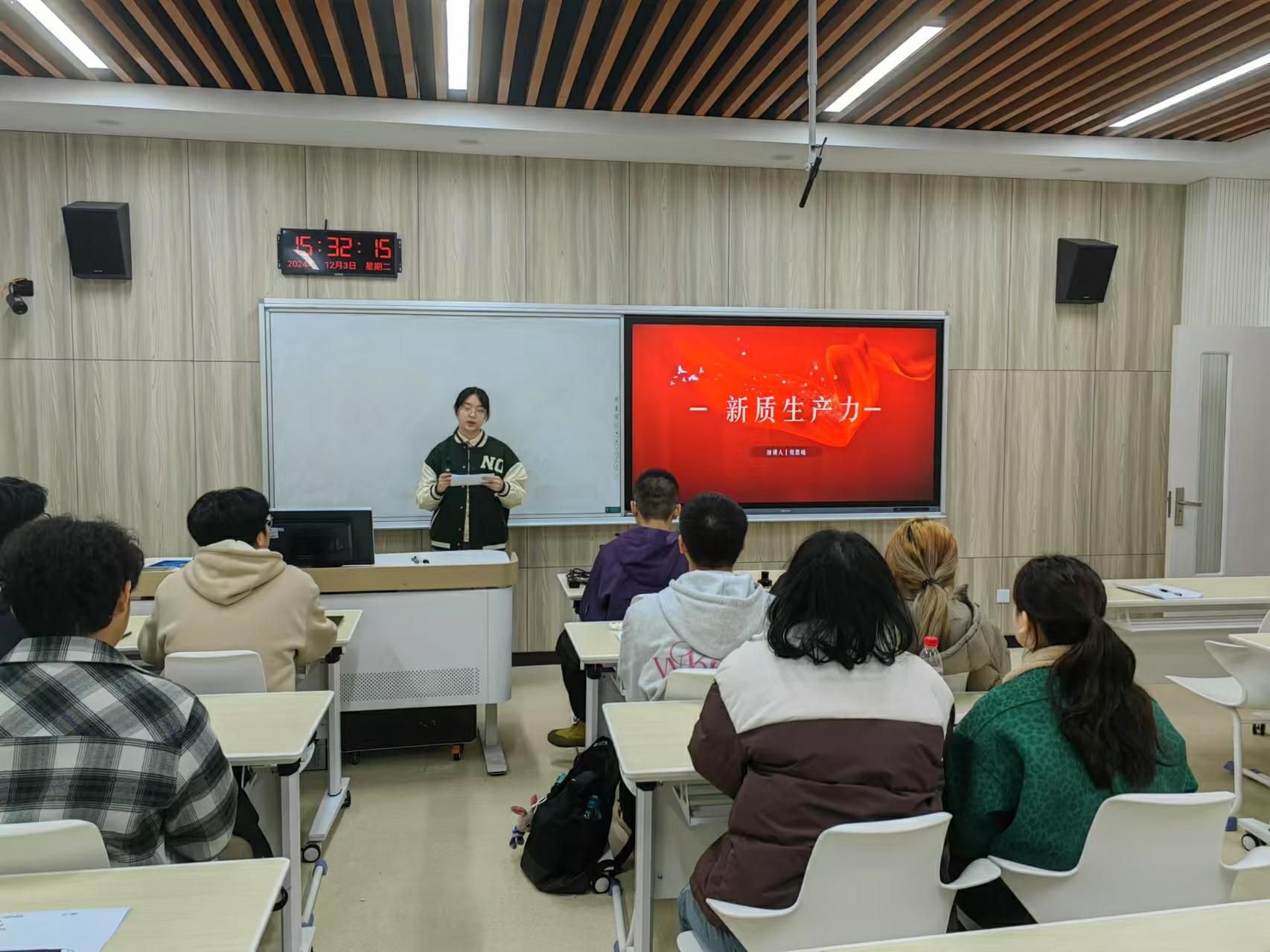 学生讲师们以 “新时代生产力的发展与变革”为主题,对何为新质生产力展开学习和宣讲培训。梁淞婷同学对新质生产力进行了概述,她提出新质生产力是基于科技创新、信息化和智能化等新兴技术手段,以高效、绿色、可持续为特征的新型生产力,她强调了新质生产力与传统生产力的区别,特别是在技术手段、生产效率和环境影响等方面,新质生产力的发展水平是衡量一个国家或地区综合实力的重要标志之一,对于提升国际竞争力具有重要意义;杨名同学从国家战略的角度出发,探讨了新质生产力的目的和意义,他结合“新质生产力”的概念,阐述了整合科技创新资源、引领发展战略性新兴产业和未来产业的重要性,提出新质生产力的发展旨在构建新发展格局,推动高质量发展,推动新型工业化,并全面建成社会主义现代化强国;王洁妤同学则聚焦于新质生产力的特点和重要意义,讨论了新质生产力在经济增长、就业结构和国际竞争力方面的重要性,并提出了为适应新质生产力发展做好准备的三个关键要素:知识储备、实践能力和创新思维。