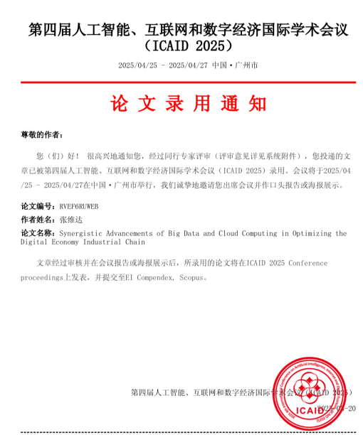 22经济学实验班张维达在学院熊兴副教授指导下申报的课题《数字经济是否“嫌贫爱富”?——基于城乡收入分配差距视角》获批重庆市教育科学规划重点课题、重庆市社会科学规划项目。撰写的论文《Synergistic Advancements of Big Data and Cloud Computing in Optimizing the Digital Economy Industrial Chain》被第四届人工智能、互联网和数字经济国际学术会议(ICAID2025)录用。