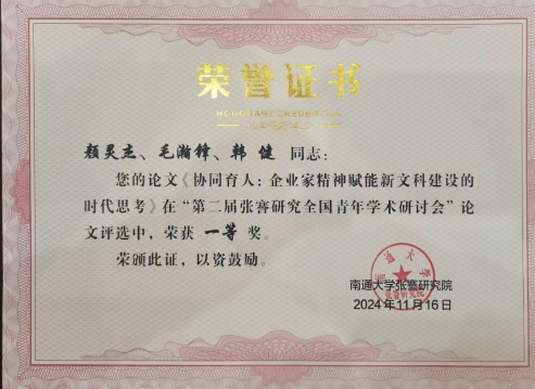 22财政1班颜灵杰同学撰写的论文《协同育人:企业家精神赋能新文科建设的时代发展》在“第二届张謇研究全国青年学术研讨会”论文评选中,荣获一等奖。颜灵杰同学撰写的论文《数实融合驱动光伏产业高质量发展的技术路径研究》在《激光杂志》发表。